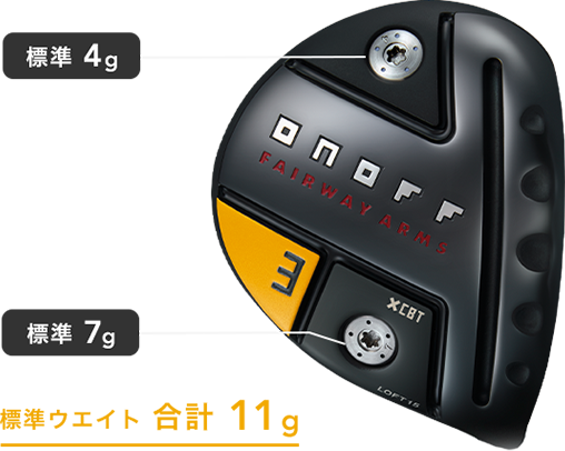 ヘッドのウエイトスクリュー(別売)を交換することで、それぞれのゴルファーに最適なヘッド重量、バランスの調整が可能です。標準仕様では11g(4+7)のウエイトが装着されています。ウエイトを±2g変更することで、バランスが±1変化します。
