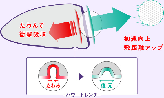 たわみ、復元することでボールを押し出し、更なる飛距離アップと、フェース全域を高初速エリアに変え、オフセンターヒットによる飛距離ロスを低減することで、今まで以上の飛びとやさしさを実現するパワートレンチ。非力な女性ゴルファーでも飛距離アップできるように、飛距離性能を追及し設計された新パワートレンチにより、さらに大きく、たわみ、復元し、反発領域がひろがったフェースのもたらす飛びとやさしさが進化しました。