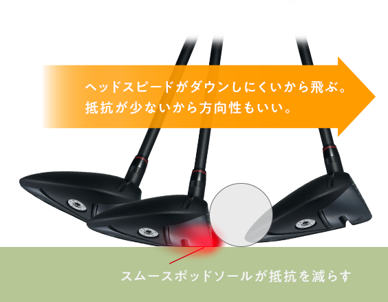 飛距離性能とミスにも強いヘッドを追及し設計された、独自のソールの溝=パワートレンチ。フェース全体が大きくたわみ、復元することで飛びとやさしさ両立しました。