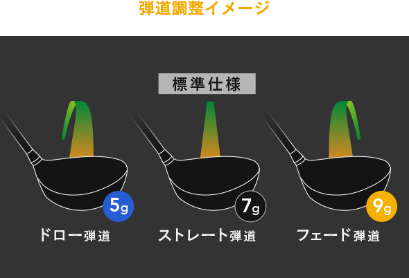 5g(標準からマイナス)のウエイトを装着することで、ドローボールで狙う、つかまる重心設定に。