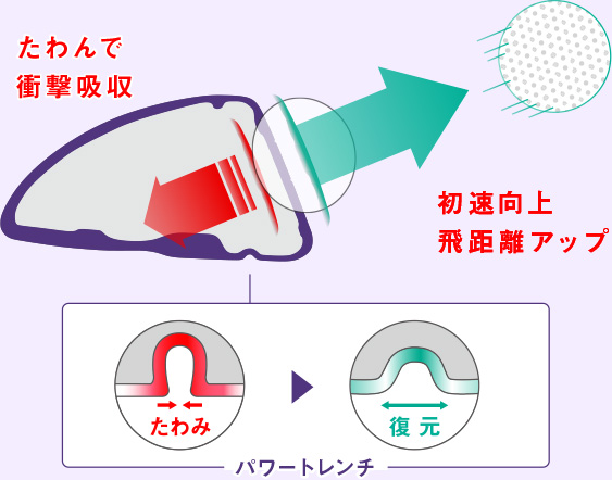 たわみ、復元することでボールを押し出し、更なる飛距離アップと、フェース全域を高初速エリアに変え、オフセンターヒットによる飛距離ロスを低減することで、今まで以上の飛びとやさしさを実現するパワートレンチ。非力な女性ゴルファーでも飛距離アップできるように、飛距離性能を追及し設計された新パワートレンチにより、さらに大きく、たわみ、復元し、反発領域がひろがったフェースのもたらす飛びとやさしさが進化しました。