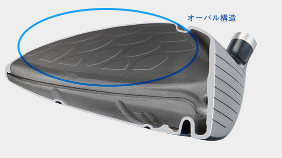 クラウン内側の形状をオーバル構造にすることでクラウンの軽量化を実現。最適重心設計のために生み出された余剰重量を再配分することで、低重心化、適度な深重心化、重心アングルを実現し、低スピン、高打ち出しで、より方向安定性が高い、やさしく飛ばせるドライバーを実現しました。